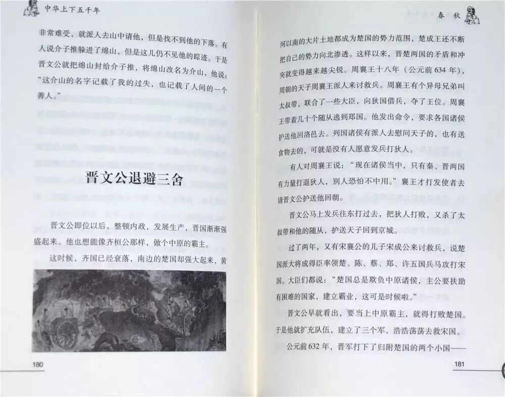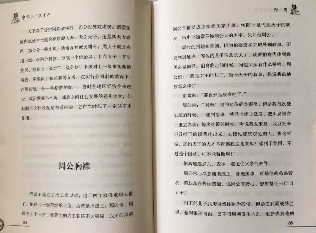 通达古今,让我们一起了解中华上下五千年的悠远历史!△图为中国历朝的领土更变 读史以明鉴 察古以知今 人人都说中华历史文化博大精深 可让你们细说却没几人知晓 你知道 康熙、雍正、乾隆三位皇帝的关系吗 你知道万里长城建设的背景和用处吗 再简单点,你知道历史朝代的顺序吗 英国人培根说:“读史使人明智”,和西方人相比,我们中国人更为重视历史,庞大的“二十四史”“中华上下五千年”就是明证。 我们每个人在成长的过程中,也同样受过各种历史故事的影响,比如“岳母刺字”、“二十四孝”等等。今天的我们,接触的文化更加多元性,然而,对中国人来说,成长时期多读点中国历史故事,是非常有好处的。 历史是一面镜子,任何一个国家和民族都注重用自己的历史教育和鼓励人民,特别是青少年。历史本来是很生动的,现代汉语中有不少成语。特别是成语典故,多半出自各种历史书籍。 在高科技发展的今天,了解和继承本民族优秀的文化传统,对于中国青少年树立民族自尊心、自信心仍是非常必要的。(选自中华上下五千年) 首先,历史故事能培养人的浩然正气 中国五千年的历史,留下了许多可歌可泣、震撼人心的故事,从 “孝感动天”到“精忠报国”,从文天祥到史可法,许多历史人物故事,无不令人读后荡气回肠、回味无穷。 周公胸襟 周武王建立了周王朝以后,过了两年就得了重病去世了。他的儿子姬育继承王位,这就是周成王。那时候,周成王才十三岁,刚建立的周王朝还不太稳固。武王的弟弟周公旦辅助成王掌管国家大事,实际上是代理天子的职权。历史上通常不称周公旦的名字,只叫他周公。 周公的封地在鲁国,因为他要在京城处理政事,不能到封地去,等他的儿子伯禽长大了,就派禽带他到鲁国去做国君。伯禽临走的时候,问他父亲有什么嘱咐。周公说:“我是文王的儿子,当今天子的叔叔,你说我的地位怎么样?” 伯禽说:“那自然是很高的了。” 周公说:“对呀!我的地位确实很高,但是我每次洗头发的时候,一碰到急事,就马上停止洗发,把头发握在手里去办事;每次吃饭的时候,听说有人求见,我就把来不及咽下的饭菜吐出来,去接见那些求见的人。我这样做,还怕天下的人才不肯到我这儿来吗?你到了鲁国,不过是个国君,可不能骄傲啊!” 伯禽点点头,表示一定记住父亲的教导。 多读这样的故事,能够培养人的浩然正气,塑造人的优良品格。很多伟大人物,往往就是因为小时候从父母那里听到这些故事,从而一生都深受影响。可见,读历史故事,其潜移默化的教育作用,不可忽视。 其次,历史故事能启迪人的智慧。 历史是前人智慧和经验的总结。小时候,司马光砸缸、曹冲称象的故事,很多人都会记忆犹新。这些历史故事中蕴含的做人、做事的智慧,对孩子心灵的启迪,是一般的童话故事不能比拟的。多读历史,能够增加智慧,对大人如是,对儿童也是如此。 第三,历史故事能陶冶人的情操。 通过读历史故事,可以让人了解历史上的人和事。知道什么样的人是好人,什么样的人是坏人,应该选取什么样的人生榜样,树立怎样的人生志向,如何修炼人生的品格。 读历史故事,可以陶冶人的情操,常读古人的事迹,自然就生起仰慕之心,久而久之,人的气质就会变化。 第四,历史故事能开拓人的视野,积累知识。 中国历史浩如烟海,要全面了解,非常不容易。但是,常常读一些小故事,久而久之,就是一种积累。一天读一个故事,一年就是三百多个故事。不仅是一笔知识财富,也是和人交谈、写作的绝佳材料。 从这点来说,无论是成年人还是少年儿童,都应该多读点历史故事,以此扩充对中国历史文化的认知。 福利时间 今天小编安利的书籍:《中华上下五千年》,让广大读者拥有一本益于心灵成长的历史读物,以便有效、快捷地传播祖国文化,是我们每个人的责任。 编者在参考了一定量权威性的历史书籍基础上,取其所长,编写了这套《中华上下五千年》。本书力求全面客观地展示中国历史发展进程中的社会进化、政治演变、经济文化发展和国土开辟等方面的状况。 尊重历史就是尊重我们自己,历史不能割断也不能凭着个人的喜好加以修改。在编写本书的过程中,笔者注重历史读物的真实性,针对历史事件中的存疑之处,反复查找到翔实资料以避免虚构。这样以期让读者在了解历史、开启智慧、培养美德的同时,并试图为读者提供更多、更确凿的历史资料。 本书按照历史发展顺序编写,以历史事件、历史人物为主线,所选取的内容上自远古时代,近到中华人民共和国成立。其范围涵盖政治、文化、科学、军事、民族关系等历史重大事件,对少数民族的历史也有相当篇幅的介绍。 五千年悠悠岁月,留下了绵延不绝的历史传承,成就的是一首大气天成的英雄赞歌。一首顽强抗争的劳动人民的赞歌,一首慷慨激昂、惩恶扬善的浩然正气之歌。五千年的沧桑巨变,五千年的兴衰成败,浩瀚的历史皆浓缩于一个个荡气回肠的故事中。 《中华上下五千年》 豪华精装版 【全8册】