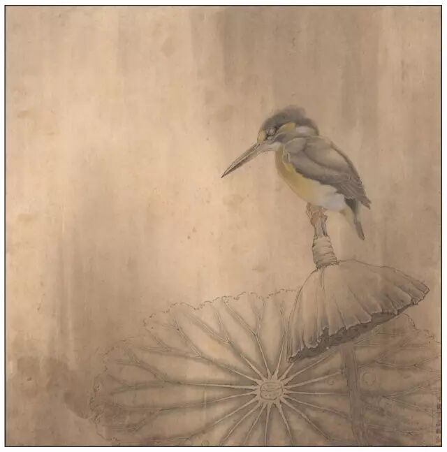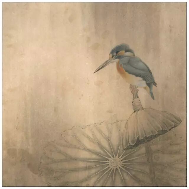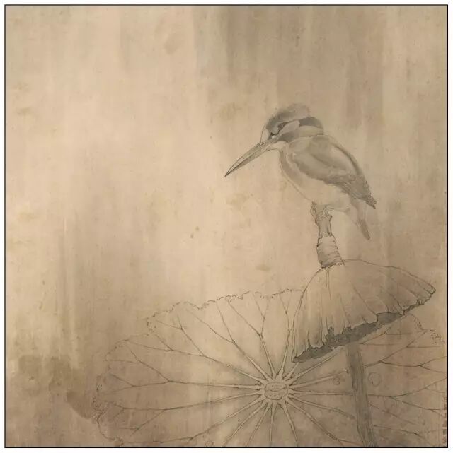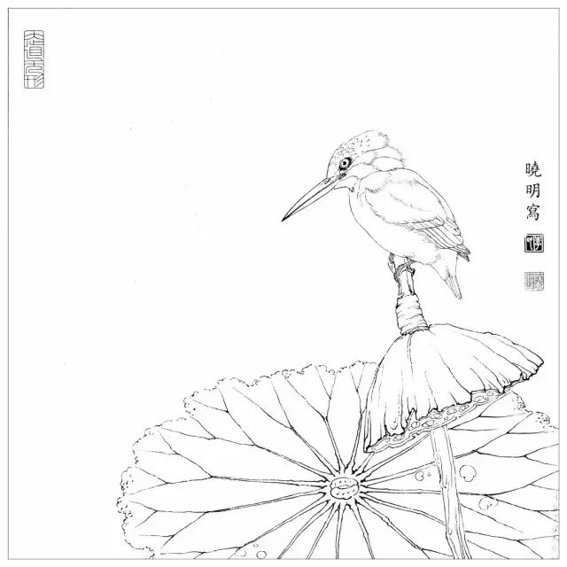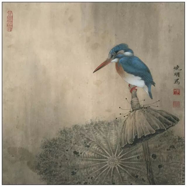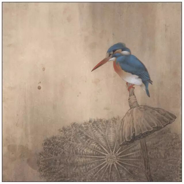 图文教程丨李晓明《独立寒秋》绘制步骤(含详细文字解析)步骤一、翠鸟身体部分大多以游丝描勾勒,飞羽等部位用细铁线描,嘴部用线尖粗根细,绒羽衔接处及脑后等处以虚线勾勒。老莲蓬用线以颤笔描法为主,用线不要过于光洁,合理的加以顿挫。莲蓬离我们较近的这一边用线要更粗一些。荷叶叶筋略呈钉头鼠尾描,但是用笔上也讲究自然率意,以松散灵活为上。荷叶破损边缘以短促而多变的细碎折线组成,和荷叶破碎的质感相吻合。 步骤二、背景先整体通刷一层淡淡的赭墨色。干后,用大号底纹笔蘸清水将纸张整体刷湿,约于6成干的时候,用中号底纹笔蘸淡墨依次在右下、左下及右上部分烘染背景,右下部分整体色泽略深,要多烘染几次。随后,荷叶的根部,莲蓬的暗面,荷杆的左右及翠鸟身体等部位均用淡墨分染,翠鸟的眼先后位置墨色稍重,飞羽、复羽等片状羽部分平涂淡墨。鸟喙上方淡墨根部往尖端分染,下方则由尖端往根部分染。 步骤三、荷叶及莲蓬继续用淡墨分染,荷叶,到了前方单线勾勒的叶筋时线条左右需留出水线。莲蓬部分的的起伏变化要仔细推敲,整体的半圆球体积感要把握准确。莲蓬下方的平面部分莲子及凹坑也需详细刻画。翠鸟,以中墨小面积分染为主,绒羽交界处大多采用虚染的方法,界线不用过于明显。片状羽等处平涂淡墨边缘留水线。前额、耳羽、前胸、尾下复羽等罩染桔黄色。下颌、下腹、后枕白斑罩染淡白粉。嘴部中墨小面积提染。爪部平涂淡朱磦。 步骤四、本步骤荷叶及莲蓬以淡墨缩小面积局部分染为主。如荷叶叶筋的根部、莲蓬老干的的结构变化等。翠鸟身体蓝色部分整体罩染淡墨青色(花青加墨),眼睛淡墨从四周往中间勒染。前胸、耳羽、前额的继续用淡赭墨色分染。背羽及额顶等处淡墨分染,刻画出翠鸟身体椭圆形的体积感。片状羽根部用中墨小面积分染。 步骤五、荷叶用点厾法直接点写出叶片上的肌理效果,笔中水分略少,到了外层边缘的破损处将笔尖打散,干笔二次点厾而成。叶脐部分及叶筋根部淡墨分染。老莲蓬也用淡墨多次皴擦,最暗处可用中墨小面积皴染。翠鸟蓝色羽毛的亮部整体罩染头青,最亮部可略加二青提染。下腹等白色部分提染中等浓度的白粉。胸部和嘴部罩染浓朱磦。耳羽根部分染朱磦,爪也平涂浓朱磦。爪尖中墨勒尖端。 步骤六、用水分饱和的淡墨在荷叶上点写色斑。老莲蓬依据空间远近的变化重墨局部复勾并在右上方加深皴擦效果。随后用重墨勾勒花丝并点出枯萎的花蕊。荷杆上的刺也用中墨细碎笔法点写。翠鸟身体蓝色部分先用淡墨丝毛,随后再用浓四青在亮部重复丝一次,头顶等最亮处可以用白粉分组小面积丝毛。前胸顶部用浓赭墨色丝毛到了下方逐渐用浓白粉衔接丝毛。其余白色部分也用白粉丝毛。爪部鳞甲用曙红细心填色,爪垫部分勒染淡曙红。嘴中线中墨复勾后焦墨点睛,浓白粉点高光。
