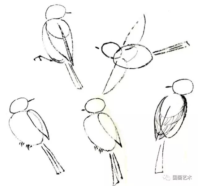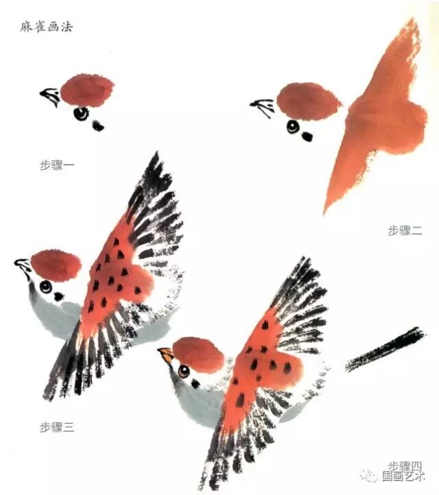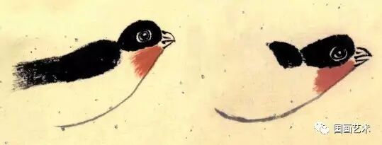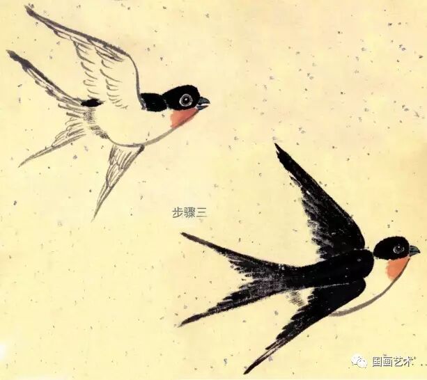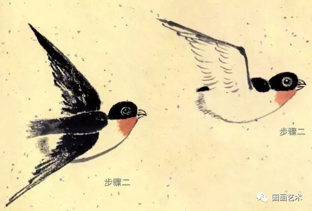 步骤二:燕子翅膀的形比较瘦长。画外侧翅膀时用重墨,以皴染为主,画内侧翅膀时用淡墨,以勾线为主。
