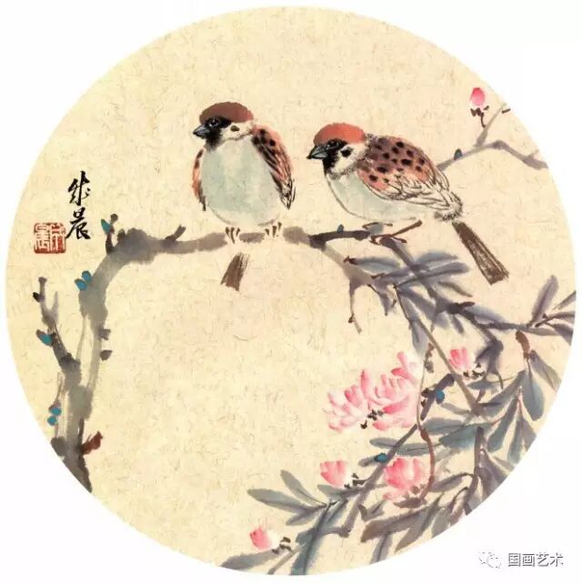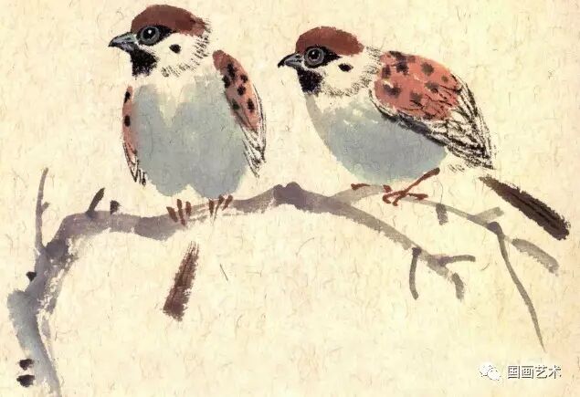 春天碧桃正盛开,迎着春风,两只活泼的麻雀是刚飞落下,还是将要飞走?粉红色的碧桃花与灰蓝色的叶子形成雅致的色彩关系,绘画中用色不必拘泥于现实的颜色。