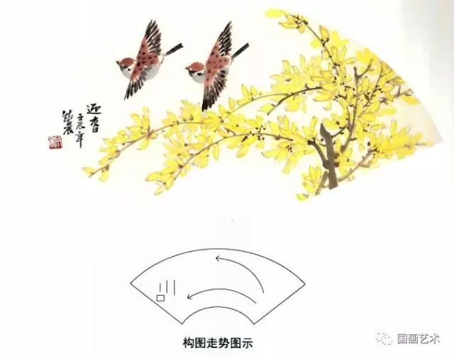 作品中盛开的迎春花,振翅飞过的双雀形成一个欢欣的迎春画面,春天万物复苏,焕发勃勃生机,也带给人们无限希望,令人振奋。