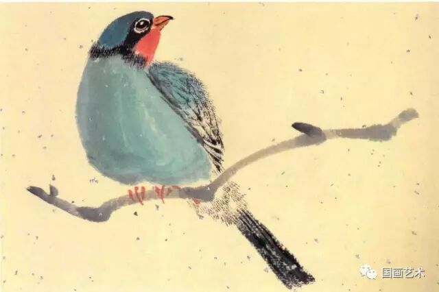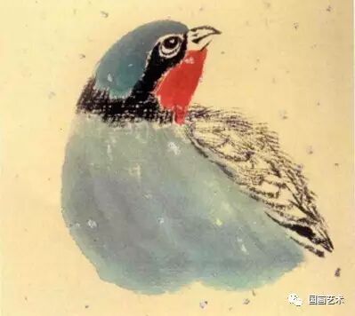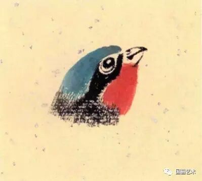 步骤一:先勾出蓝雀的眼睛和喙,头部调墨点出头顶部,朱磦点出下颌部位,浓墨干笔画出眼睛周围黑色的绒毛,散锋丝毛法画出颈部羽毛。