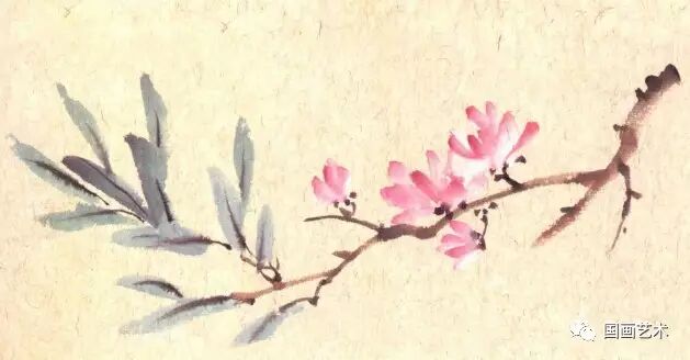 先勾枝干,淡花青墨或赭墨点叶,浓墨勾出叶筋。调白色,笔尖蘸少量三绿或花青,点出花形,三绿调花青点出花蒂,淡墨勾花柄将花连接起来。